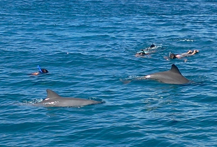 Depuis octobre 2012 un couple de dauphins viennent nager avec les baigneurs autour des voiliers au mouillage dans l'archipel des Saintes.