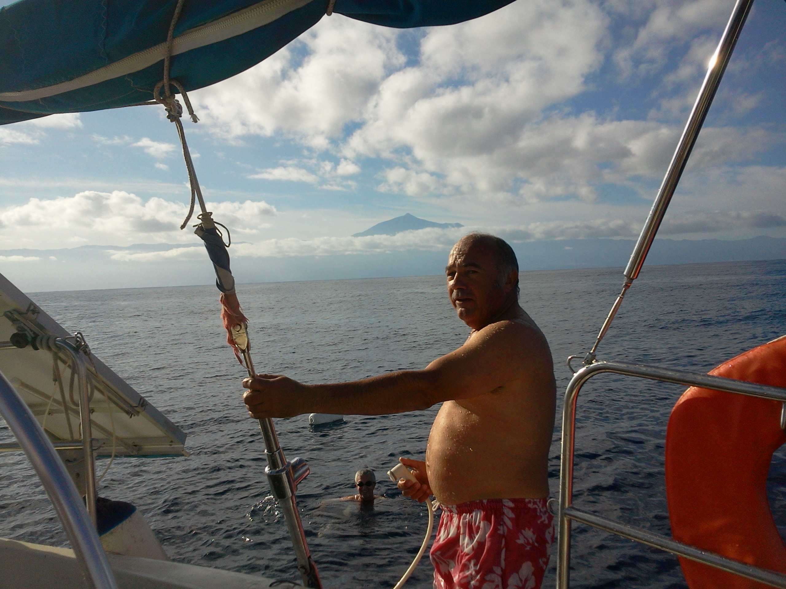 Vers midi, afin d'alléger le voilier je décide un arrêt baignade et grosse douche obligatoire pour tous.
