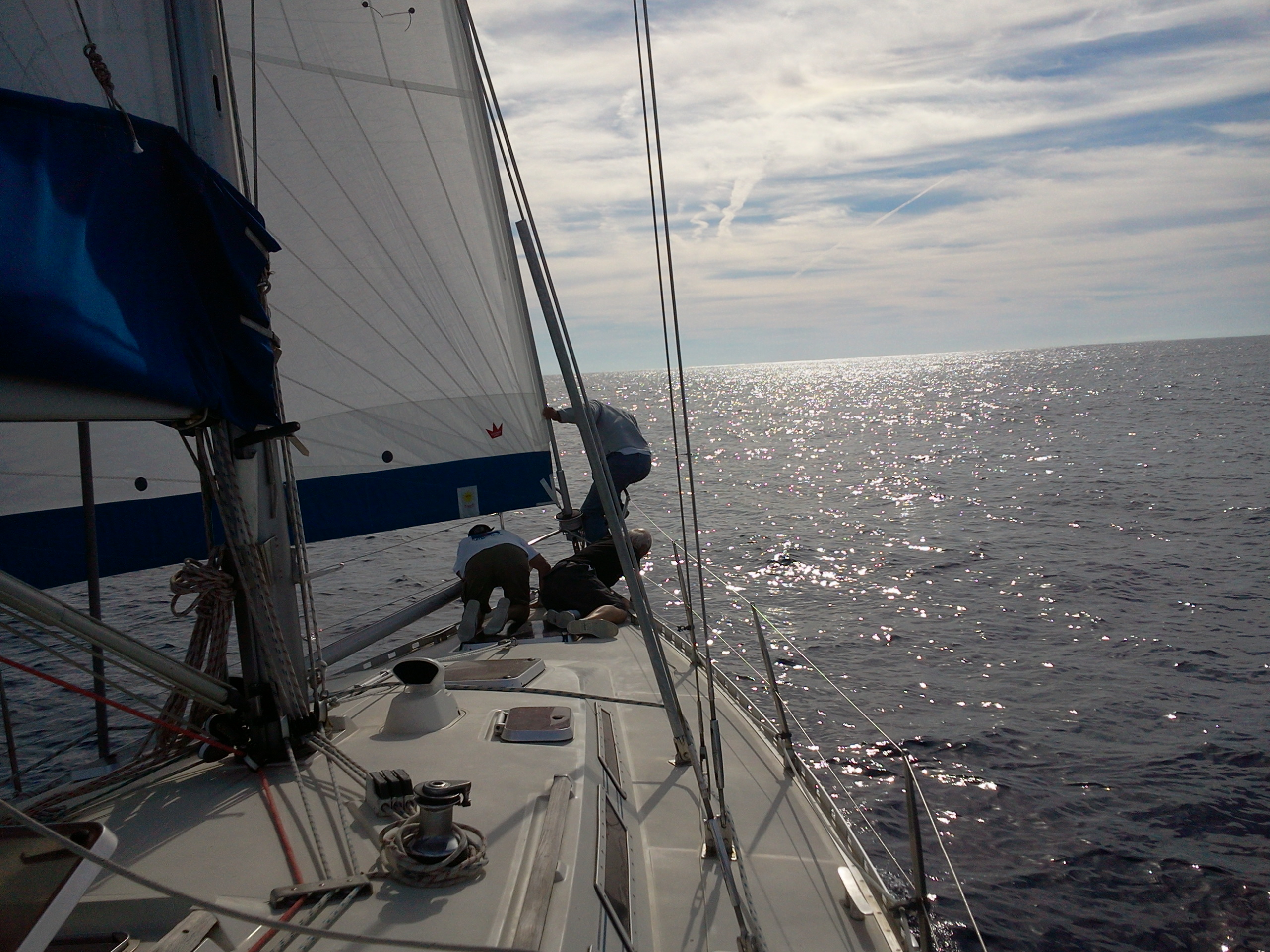 Le lendemain le vent passe au vent arrière ce qui nous amène à tangonner le génois. Manoeuvre, plusieurs fois effectuée déjà avec l'équipage précédent, dont J.. qui est resté à bord.